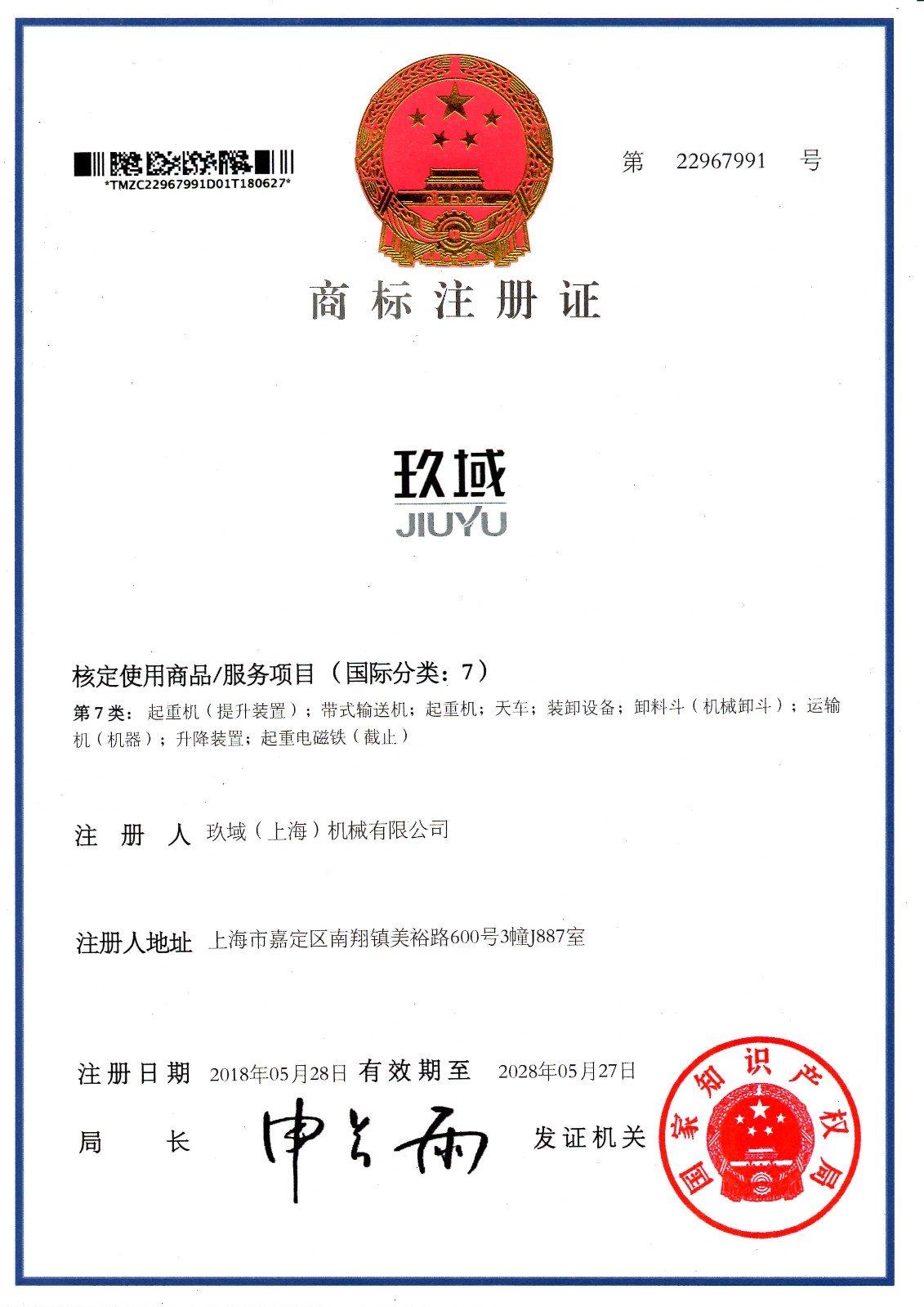玖域(上海)機(jī)械有限公司于2018年5月28日正式獲得國(guó)家知識(shí)產(chǎn)權(quán)局頒發(fā)的“玖域/JIUYU”商標(biāo)注冊(cè)證。