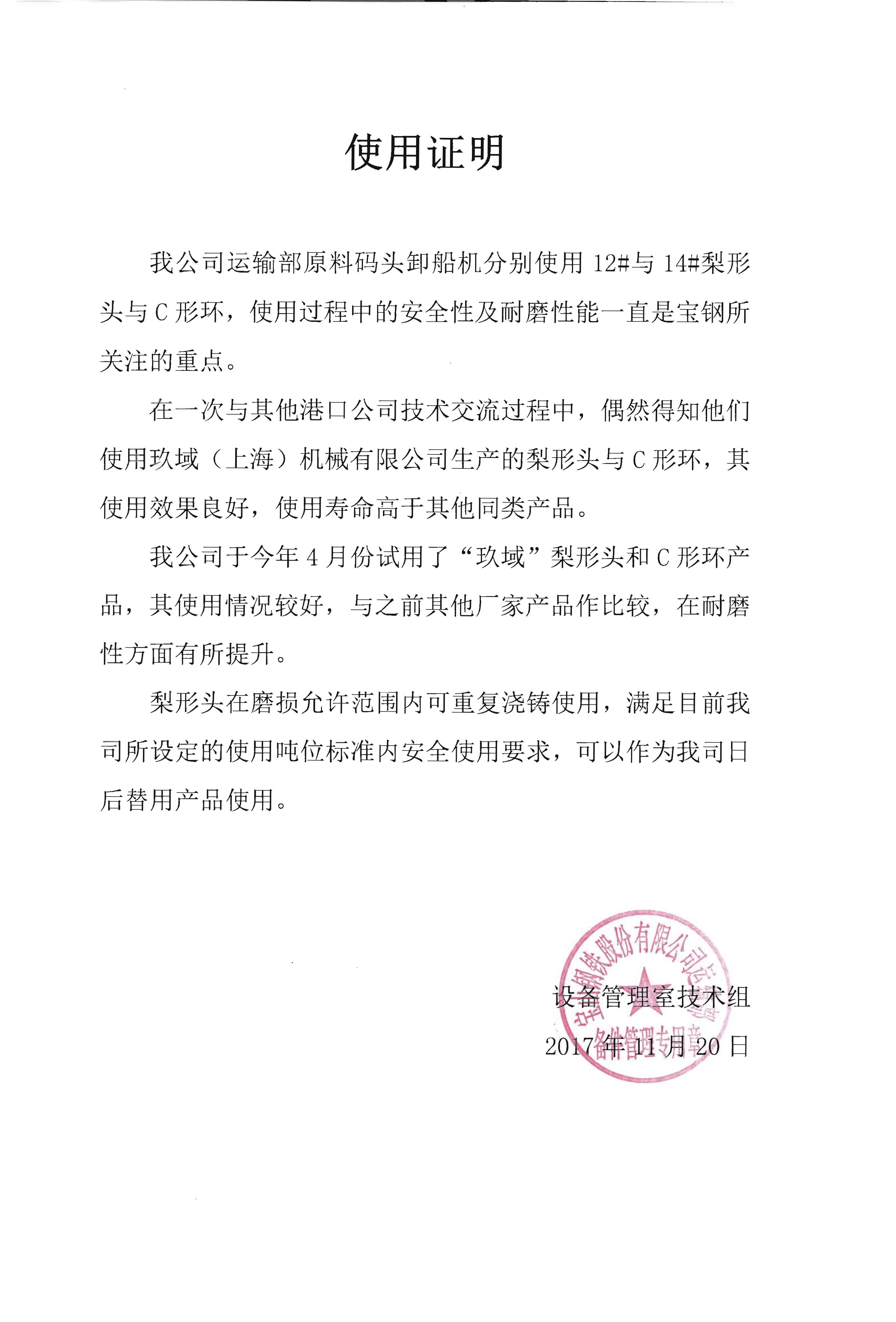 寶鋼股份有限公司運輸部原料碼頭卸船機分別使用我公司12#及14#梨形頭及C型環(huán),使用效果良好,使用壽命高于其它同類產(chǎn)品.使用至今半年多,未發(fā)生任何安全事故,據(jù)現(xiàn)場反饋穩(wěn)定可靠,在使用壽命上,相比以前的產(chǎn)品有較大幅度的提升,梨形頭已反復(fù)澆鑄多次,從磨損程度上看,還可繼續(xù)重復(fù)再次使用,得到碼頭點檢的好評!