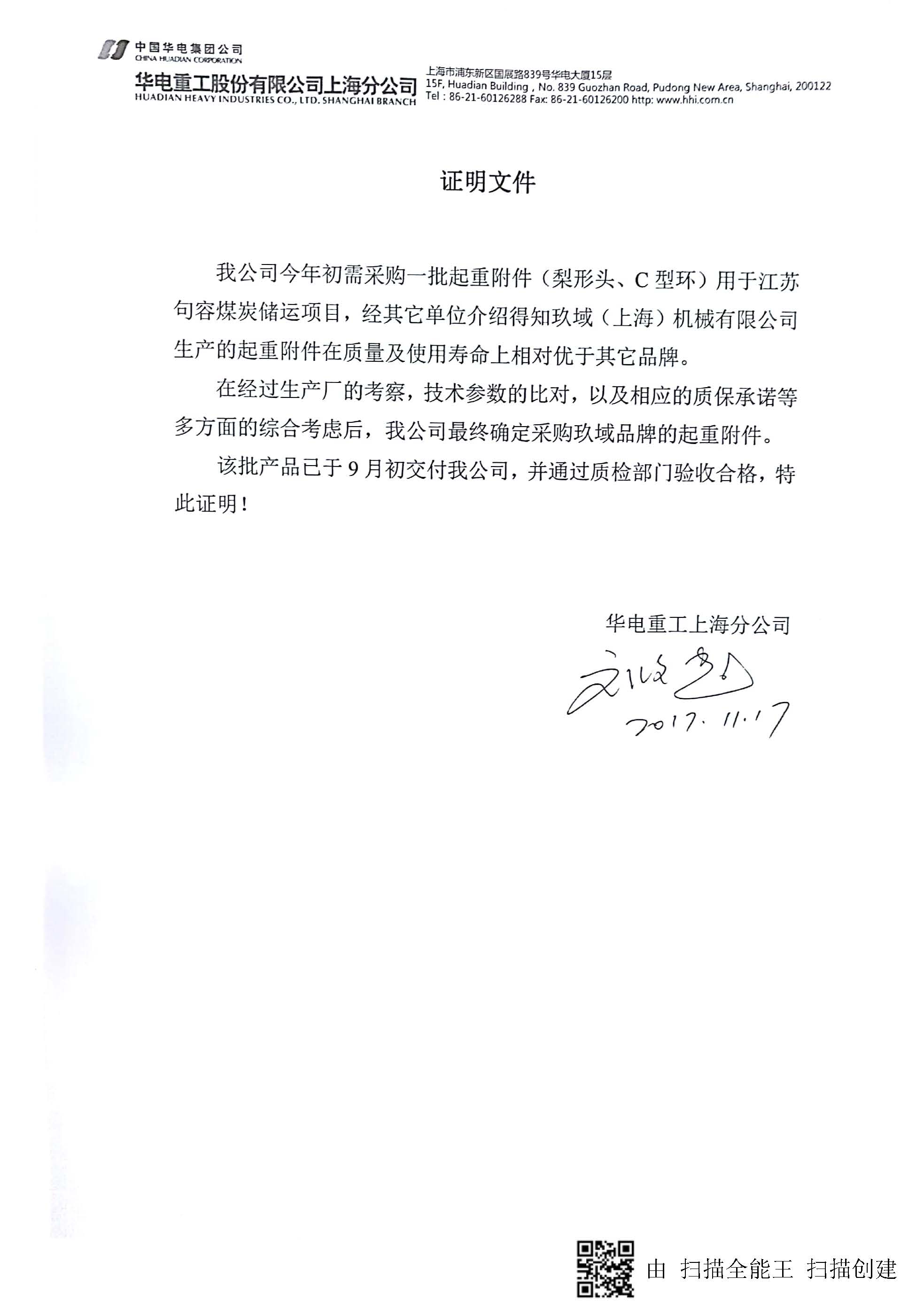 華電曹妃甸重工有限公司于今年初需采購一批起重附件(梨形頭、C型環(huán))用于句容電廠二期項目,在經(jīng)過生產(chǎn)廠的考察,技術(shù)參數(shù)的比對,以及相應(yīng)的質(zhì)保承諾等多方面的綜合考慮后,最終確定采購我公司“玖域”品牌的起重附件。該批產(chǎn)品已于9月初交付,并通過華電曹妃甸重工質(zhì)檢部門驗收合格!
